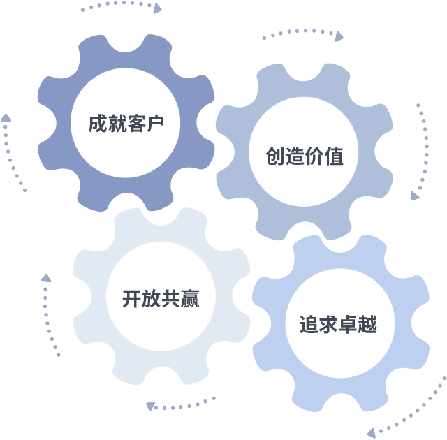 成就客户是一切决策的出发点,,,,创造价值是衡量所有工作的标准,,,追求卓越是我们做事做人的态度,,,,开放共赢是我们的格局也是最终的结果。。价值观的齿轮环环相扣,,,,推动着组织里的每个人不断向前。。